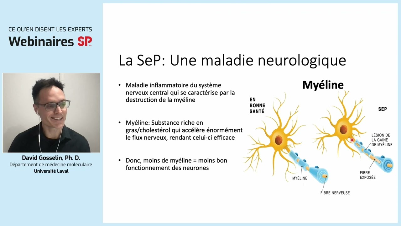 De la série Webinaires SP – Ce qu’en disent les experts Diffusion du 19 février 2024. Plongez dans le monde fascinant de la recherche sur la SP lors de notre webinaire en compagnie de David Gosselin, Ph. D., chercheur québécois dans le domaine de la SP. Vous en apprendrez plus sur les avancées récentes, les défis persistants ainsi que les pistes intéressantes en lien avec cette maladie neurologique. Animation : Jean-Sébastien Lavoie Intervenantes : David Gosselin, chercheur et professeur agrégé, Université Laval.